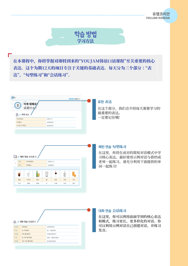 恭喜你完成了YOUJAM的韩语字母课程!在正式开始'YOUJAM韩国语会话课程'之前,我们先来学习一些必备的基础表达。