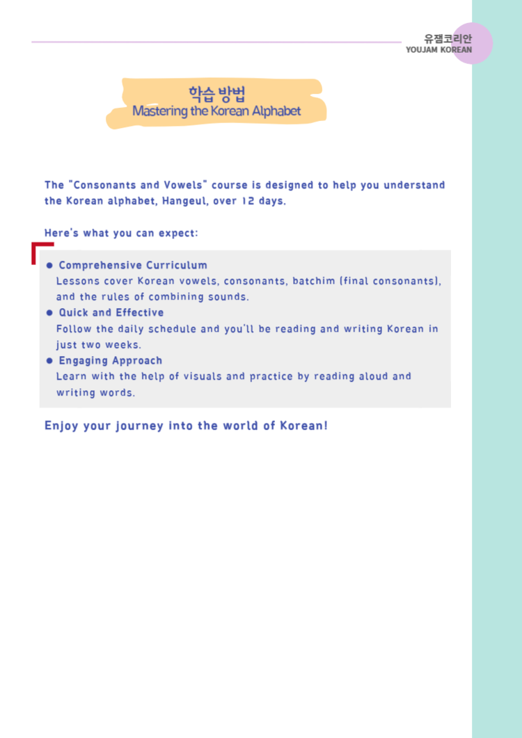 The "Consonants and Vowels" course is designed to help you understand the Korean alphabet, Hangeul, over 12 days. Here's what you can expect: