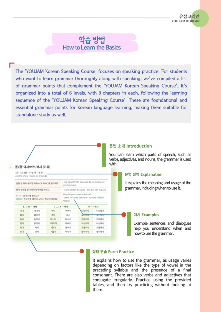 For students who want to learn grammar thoroughly along with speaking, we've compiled a list of grammar points that complement the 'YOUJAM Korean Speaking Course'. But these are foundational and essential grammar points for Korean language learning, making them suitable for standalone study as well.